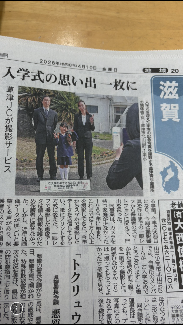 2026年4月12日 / 最終更新日 : 2026年4月12日 草津青年会議所 事業報告 4/8.9に新入学記念撮影事業を実施しました! こんにちは! 草津青年会議所です! 草津青年会議所では 4/8(水)4/9(木)に 新入学記念撮影事業を実施しました。 詳しい概要は前回の投稿見て頂ければと思います。 今年から仕様を大きく変えたことにより さまざまなトラブルを想定していましたが 天候にも恵まれ、また、シニアメンバーをはじめ 多くの団体の皆様にご協力頂いたことで、大きな 事故なく終わることができました。 ご協力の頂いた皆様 本当にありがとうございました。 また、京都新聞様にも取材に来ていただき 4/10(金)の記事に掲載頂きましたので そちらも是非ご覧下さい! コメントを残す コメントをキャンセルメールアドレスが公開されることはありません。 ※ が付いている欄は必須項目ですコメント ※ 名前 ※ メール ※ サイト